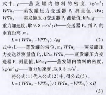 (1)控制精准的前提条件必须是测量准确。生产中为蒸发罐设置了三个差压变送器,来测量蒸发罐不同部位的压力值(如图1):分别是P1、P2、P3,根据公式(1)计算出密度P的值,然后带人到公式(2)中得出液位的高度。