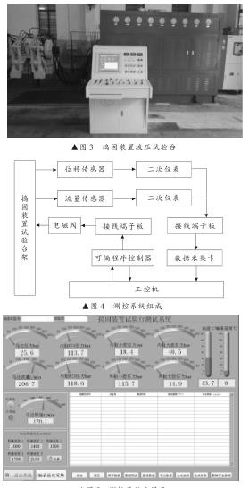 控系统主界面如图 5 所示。由图 5 可以看出,测控系统具备以下功能: ① 液压马达、液压油缸流量和压力参数的实时显示; ② 系统运行的控制与监视; ③ 试验参数的设置; ④ 试验数据的保存和后处理; ⑤ 测试结果报表的生成与打印。