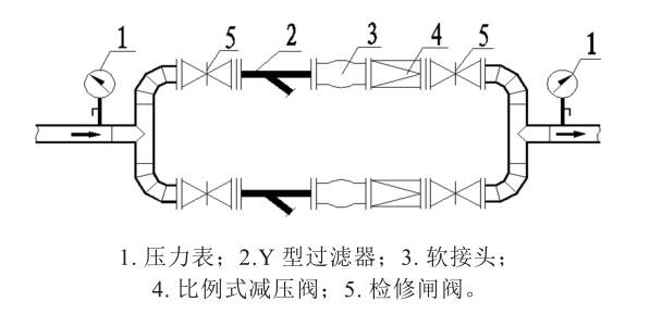 减压阀一般采用并联安装,便于检修及维护,阀前后设置压力表及其他必要配件。减压阀安装方式如图 1所示。